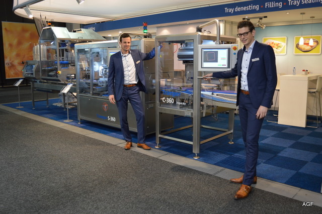 GKS Packaging BV. Wim van der Meulen en Roland Witvoet tonen de verticale vorm, vul en sluitmachine. Deze machine wordt gebruikt voor toepassingen zoals bewerkte groenten. De machine is nat te reinigen.