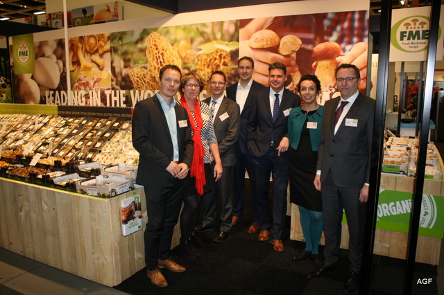 Het FME-team met Gerard Moerman, Els Verburg, Corné Verboom, Matthijs Verburg, Marc van der Zandt, Taiana Feve-Engelen en Arie Verburg. FME presenteerde een internationaal inspirerend paddenstoelenschap