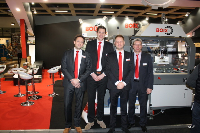Bart Triemstra van Thoms Verpakkingen in de stand van Jeffrey Wupken en Martijn de Graaf van Yex