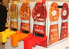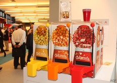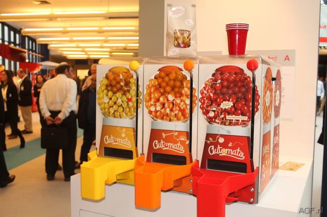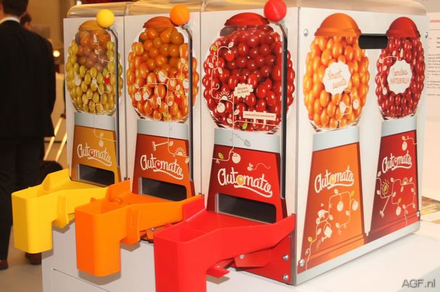 Met Automato van het Belgische tomatenbedrijf Stoffels is het gemakkelijk tomatentappen. Verschillende soorten cherrytomaten rollen na het overhalen van de hendel uit de vakken.