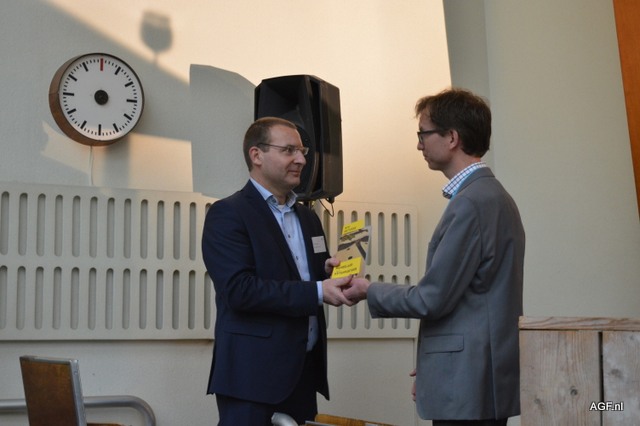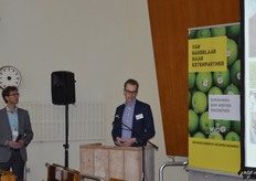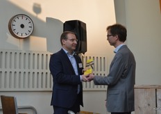 Peter Verbaas van het GroentenFruit Huis krijgt een bundel met duurzame initiatieven overhandigd.