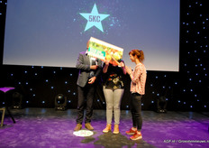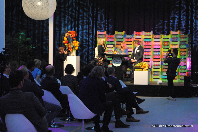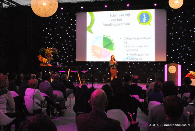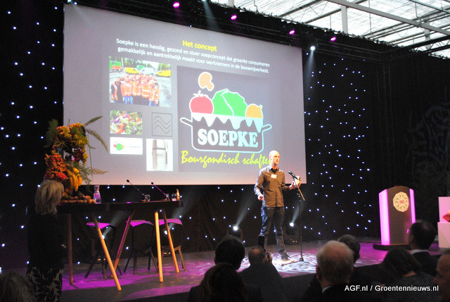De uitreiking van het Beste Groente Idee van Nederland. Suzanne de Groot pitchte over de Dutchie Dosa: een vegan wrap op basis van kikkererwten, gevuld met groente.