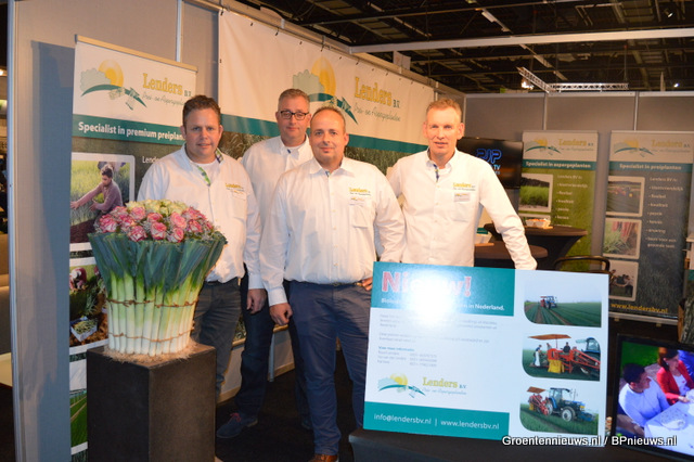 Het team van Lenders met de plaat van de biologische opkweek van preiplanten