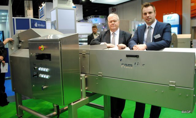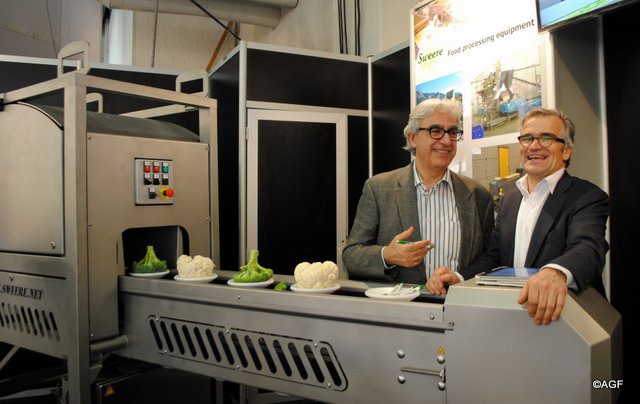 Marc de Peuter en Niels van Laer van FAM bij de FAM Lifis. De FAM Lifis is een hygiënische, flexibele V- bandsnijmachine voor het snijden van verse bladgroenten, alle slasoorten, bolvormige groenten en van langwerpige groenten zoals rabarber, prei of selder en fruit.