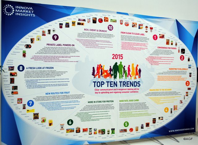 Lopend van hal naar hal kwam je nogal wat tegen. Bijvoorbeeld deze top 10 trends 2015 in de voedsel- en drankmarkt volgens de Innova Market Insights.