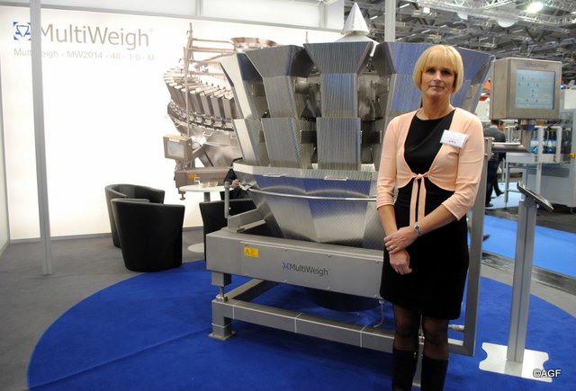 Carla Onckles-Koppen van Multiweigh met een weger uit de HR serie. Deze is voornamelijk geschikt voor bladsla, spinazie en groenten. Er is tot 20% meer vermogen vanwege de nieuwe Multiweigh triltechniek toe toegepast word.