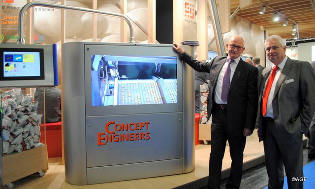 Rob Bornstein en Frank Tukker van Concept Engineers. Met deze demonstratie unit kunnen ze met video's laten zien hoe de machines en systemen werken.
