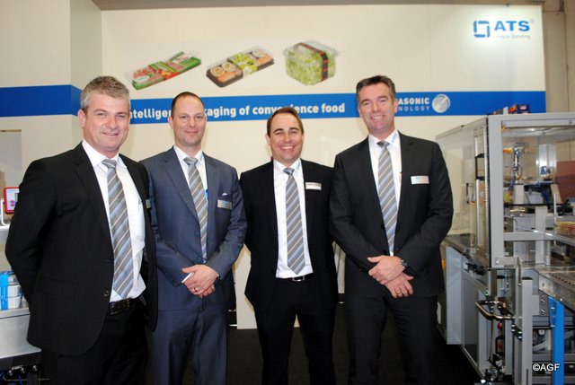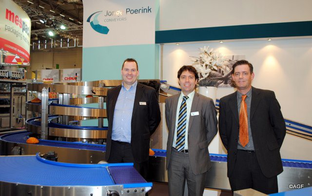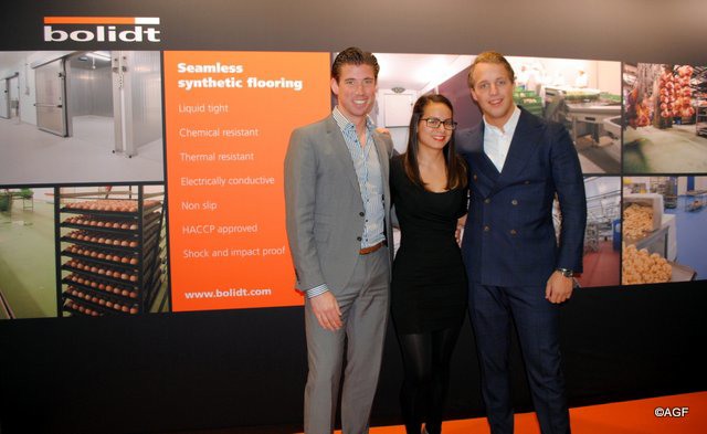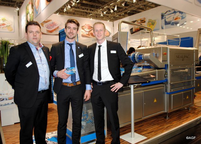 Rickard Svensson (Nemco), Jop Kelderman en Rune Mølgaard (Nemco) bij Sealpac op de stand. Nemco Food Industry solutions is een distributeur van Sealpac.