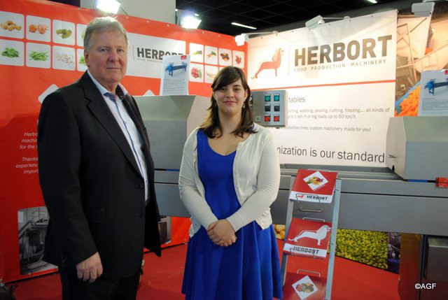 Ad Kievit en Debbie Boen van Spiessens Machinebouw bij het moederbedrijf Herbort op de stand. Er was veel interesse is deze snijmachine voor het in 4 delen van producten, bijvoorbeeld voor aardappelwedges.