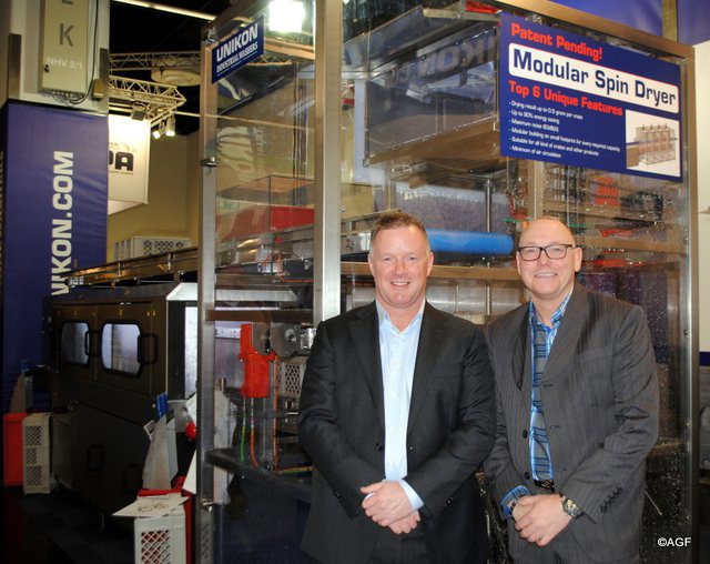 Eric Planqué en Piet Scholtanus van Unikon Industrial Washers. Zij introduceerde deze Modular Spin Dryer. Deze droger zorgt ervoor dat gewassen kratten minder dan 1 gram vocht overhouden na het wassen.