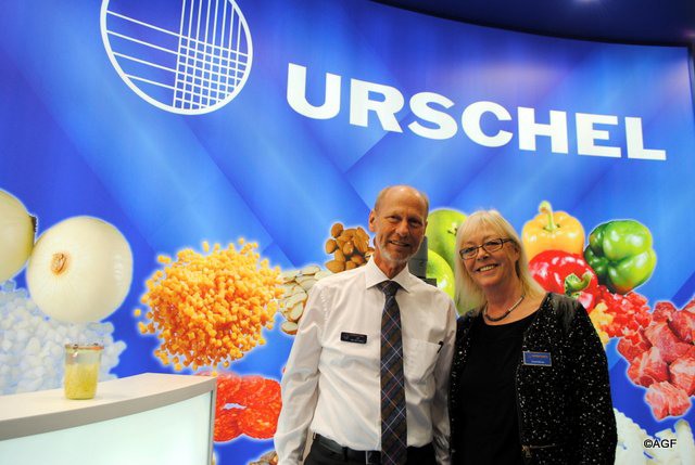 Jan van der Horst met Cristel Böhmer van Urschel. Zij presenteerden onder andere de Comitrol® Processor, Model 1700. Voor onder andere verwerking naar groente en fruitpuree.