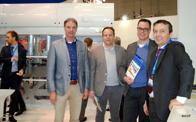 Hans Peelen, Jaap van der Sar en Mark van der Kamp van Sarco op de stand bij Adriano Favaro, Ilapak. Sarco Packaging is agent voor de machines van het zwitserse bedrijf Ilapak.