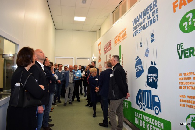 Ingrid Henderickx van Fresh Park Venlo en Jack Lagrand van Fris-Co Fruit & Vegetables luisteren aandachtig bij aanvang van de rondleiding door De Verspillingsfabiek