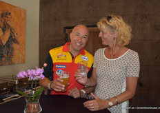 Tim Coronel pakt ook nog even een biertje mee. Op de foto met Karin Zwinkels.