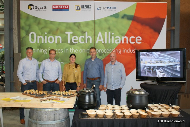 OTA zette de traditie voort met de uiensoep van de caisson. Van links naar rechts Wim de Rijder, Marco Maljaars (Eqraft), Hilanda de Bruine van De Caisson, John de Bat van Symach en Matthias Mergaert van Deprez Construct