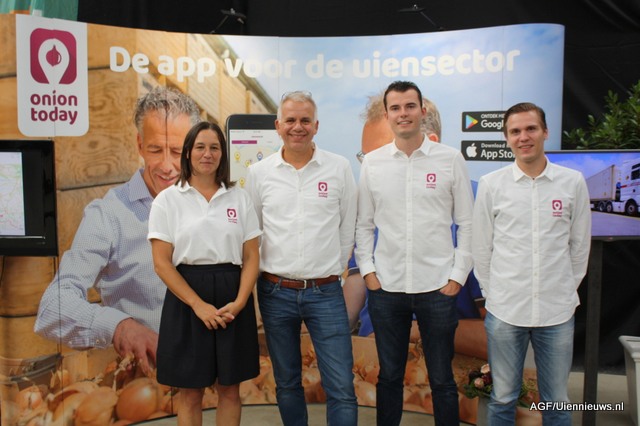 Anouk Slegers en Wim Menu met de app-bouwers Ton Freijser en Stefan Slabbekoorn van Mission. Er was veel aandacht voor de lancering van de uienapp Onion Today