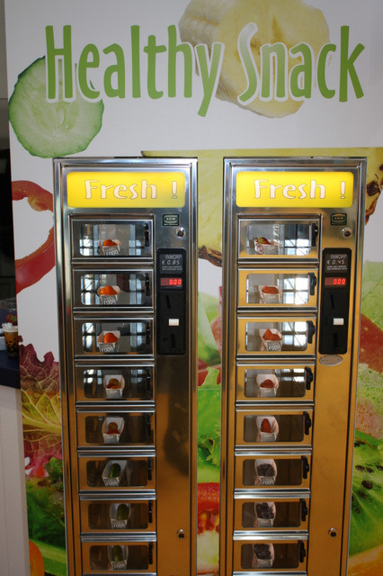 Het Healthy Snack automaat van de Holland Fresh Group. Ger kon er muntjes in blijven gooien...