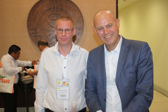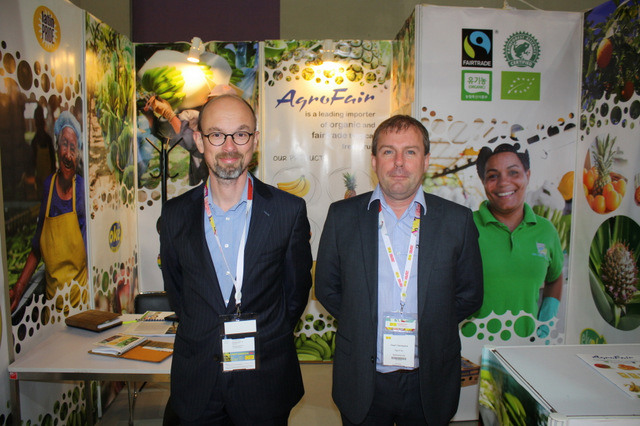 "Hans-Willem van der Waal en Geert Demeyere van AgroFair. Sinds dit jaar werkt AgroFair met bananen uit Nicaragua. Vanuit China is er nog niet al te veel interesse in Fairtrade-bananen, maar wel vanuit andere Aziatische markten, zoals Japan. "Fytosanitair zijn er wel belemmeringen, maar niet zo groot, dat we ze niet op kunnen lossen."