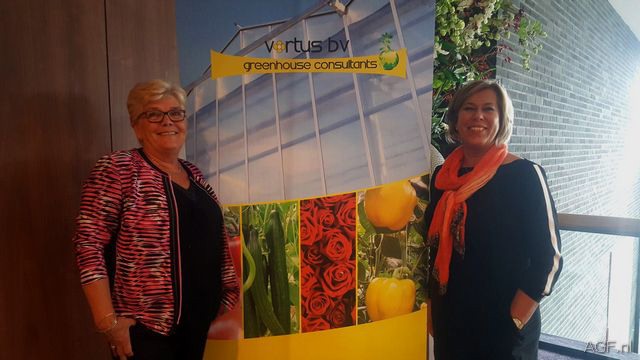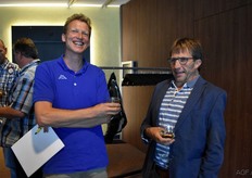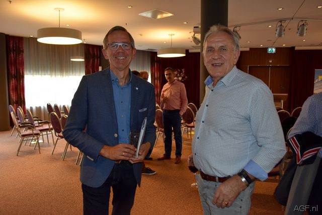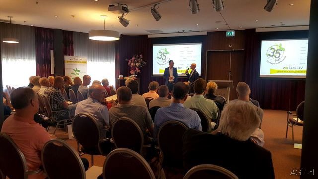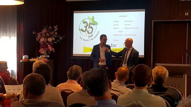 Barend Lobker van Vortus Greenhouse Consultants met dagpresentator Maurice Wubben op het 35-jarig jubileum van Vortus Greenhouse Consultants