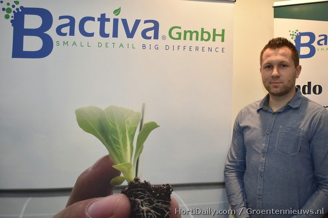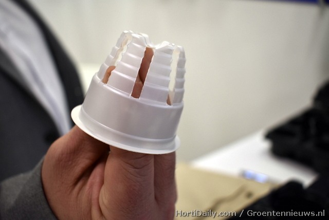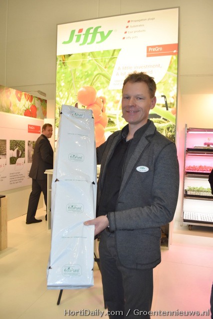Arjan van Leest toont de nieuwe Jiffy growbag: bioafbreekbaar, met enzymen in de verpakking die het folie in drie jaar afbreken zonder dat daar een minimumtemperatuur voor nodig is.