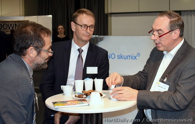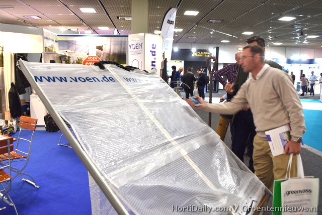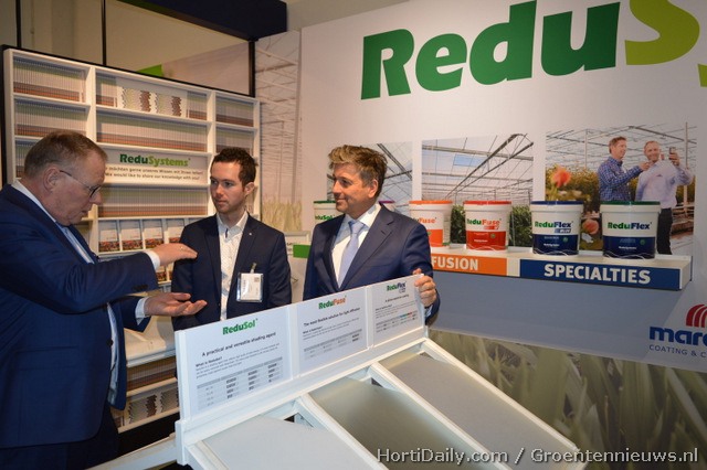Jelle Hoogland (Mardenkro) legt aan Thijmen Tiersma (GroentenNieuws) alle details van hun schermmiddelen uit. Paul van Gils (Mardenkro) luistert mee.