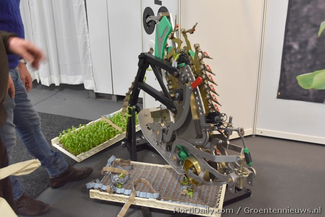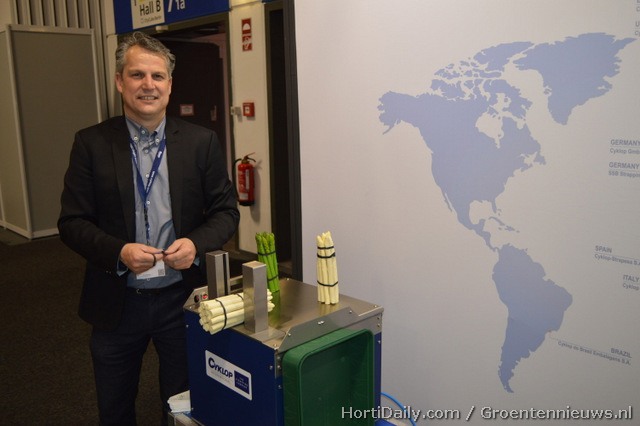 Wijnand Visser van Cyklop toont de Strepper, een machine die groenten bundelt met rubber banden