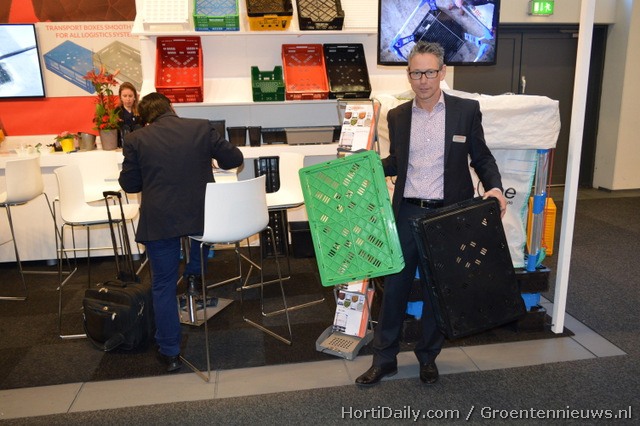 Jerry Arkensteijn van Beekenkamp Verpakkingen toont de nieuwe zwarte krat met vlakke bodem, die niet beschadigt.
