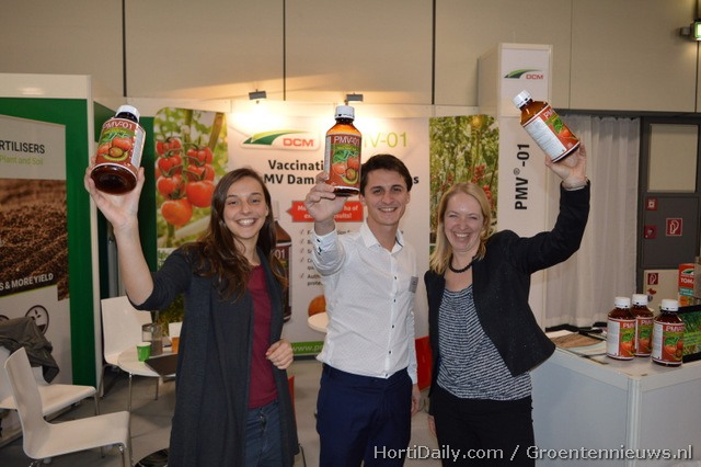 Nele van Kamp, Thijs de Langhe and Annelies Justé met de PMV01, een oplossing tegen PepMV