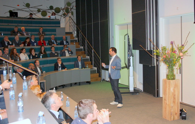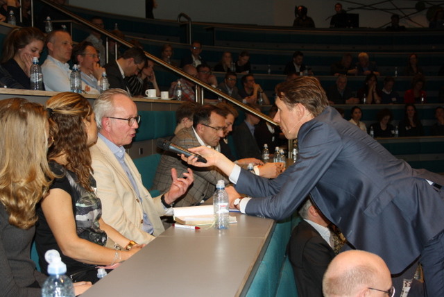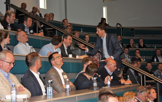 Rutger Mollee, bekend van het satirisch online dagblad 'De Speld' is dagvoorzitter en peilt de mening van het publiek.