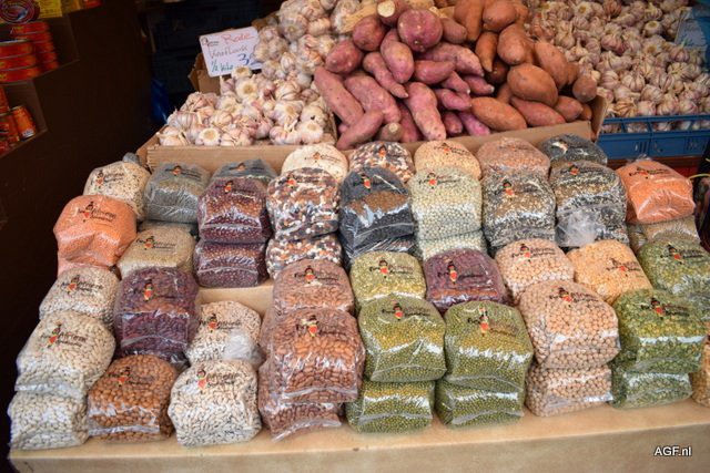 A.J. den Boer heeft ook een kraam met biologische, skal gecertificeerde peulvruchten, bio-uien, - aardappelen en -gember
