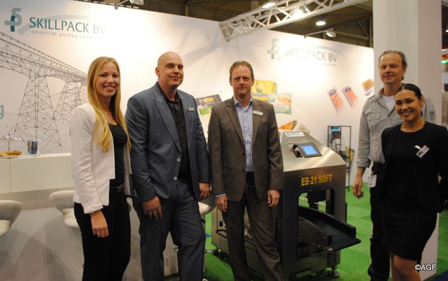 Het team van Skillpack. Skillpack is de nieuwe agent voor Frutmac Italië en leveren nu dus bijvoorbeeld deze EB-21 Soft speciaal voor de AGF-sector. Met name voor appelen, peren en zachtfruit. Zeer geschikt voor het verpakken van kwetsbare producten in zakken, met wel 20-25 zakken per minuut.