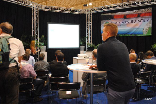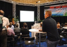 Op verschillende plaatsen op de beursvloer waren presentaties te volgen.