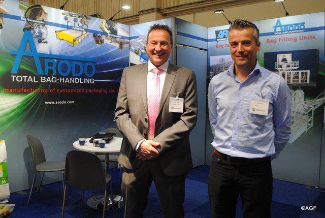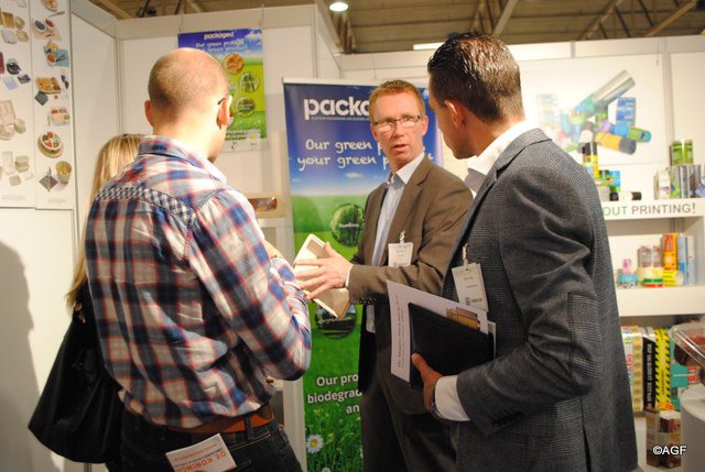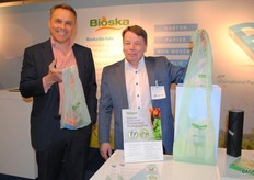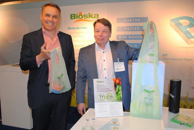 Günther Beekman (IPP International Paper & Plastic) en Jukka Suvisalmi (Plastiroll). Er was veel interesse in Bioska Bio-Folie van maar 12 micron dik. Dit kan gezien worden als de vervanging van de gratis plastic zakjes. Deze Bio-folie is afbreekbaar en kan gewoon in de groene bak.