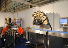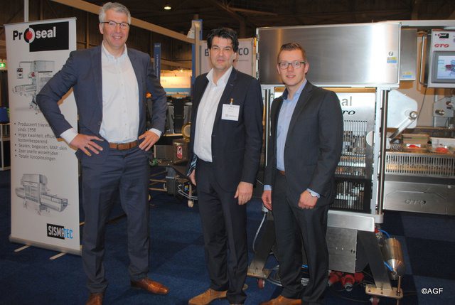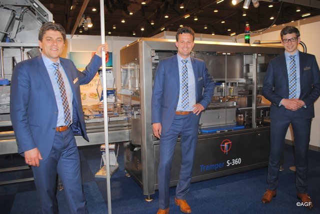 En ook hier de mannen van Tramper Technology. Marco, Barry en Rolf stonden weer paraat. Deze trayseallijn is inclusief ontnester (D-360), een afvulsysteem (F- 360) met geïntegreerde aandrukunit en een sealmachine type S-360. Dit is de eerste keer dat ze dit presenteren met aandrukunit. En het is geschikt voor bijvoorbeeld bladgroenten.