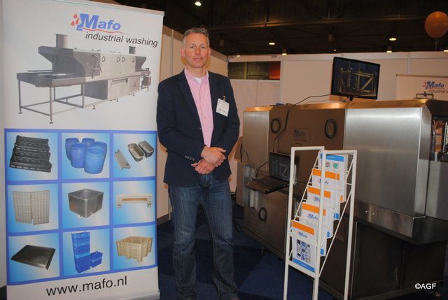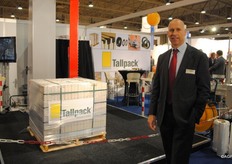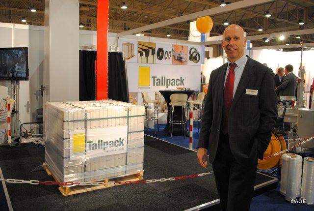 Dhr. Mulder van Tallpack met de Tallwrapper. Nieuw is de een knip- en sealunit op de vloer. Verder zijn vorig jaar de draaitafelwikkelaars geïntroduceerd, welke het voordeel hebben dat ze in stroken wikkelen en ook foliekosten besparen.