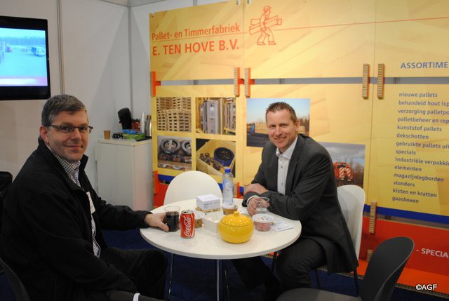 Ronald Ten Hove (rechts) van Pallet- en Timmerfabriek E. Ten Hove in gesprek op de stand.