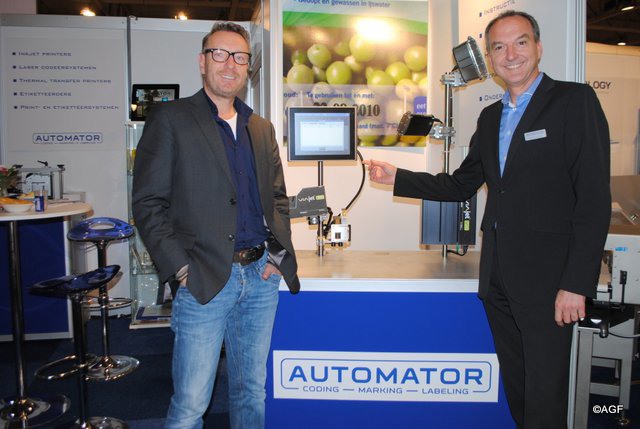 Remco Krosenbrink en Jan-Willem Mantel van Automator. Veel interesse naar het inktjetsysteem van Matthews, welke super geschikt is voor de industriële omgeving. Zowel de cartridge als DOD wordt met 1 controller geregeld.