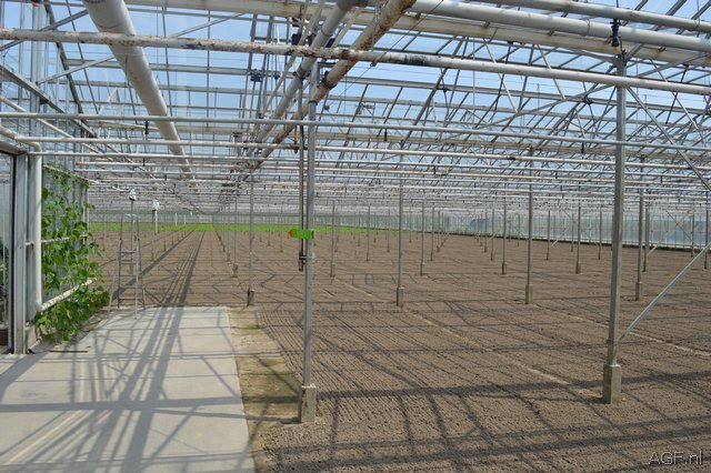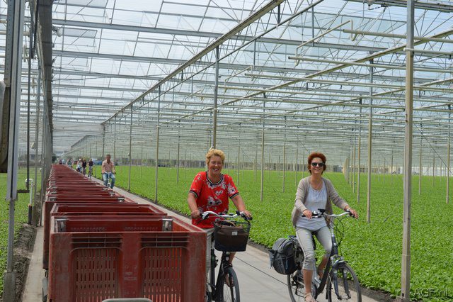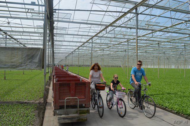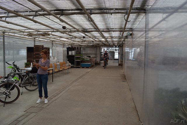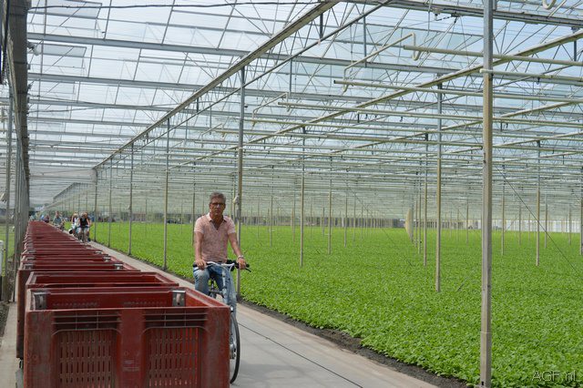 Een van de organisatoren, Rick van Koppen, in de kas bij Prominent. Voor de deelnemers bleef het vanwege hygiëne bij kijken vanuit de schuur.