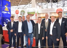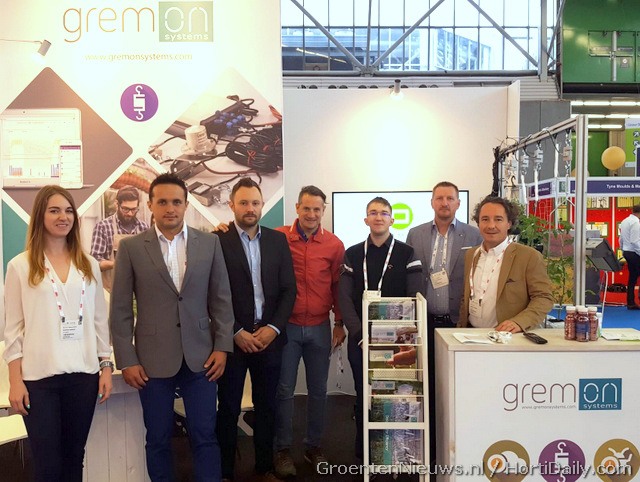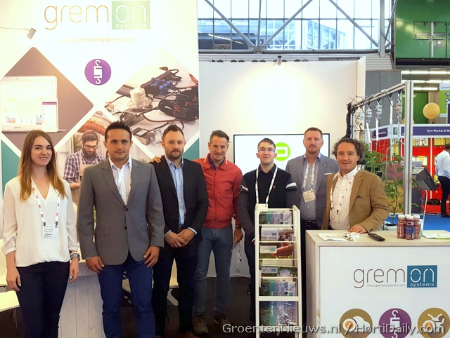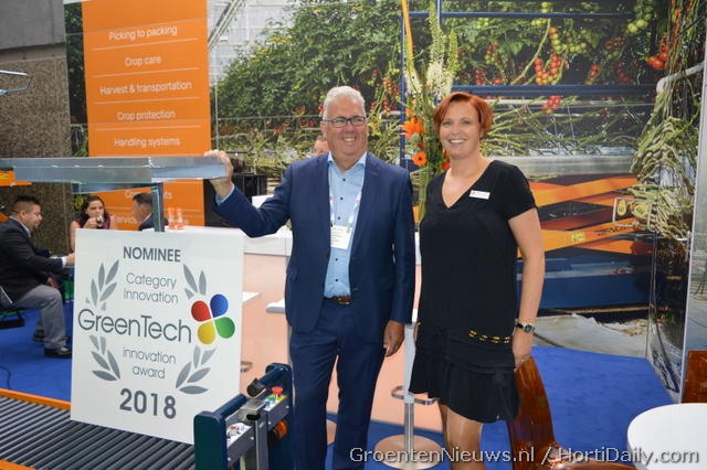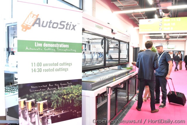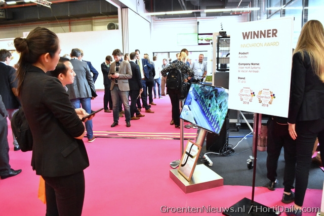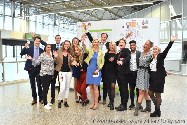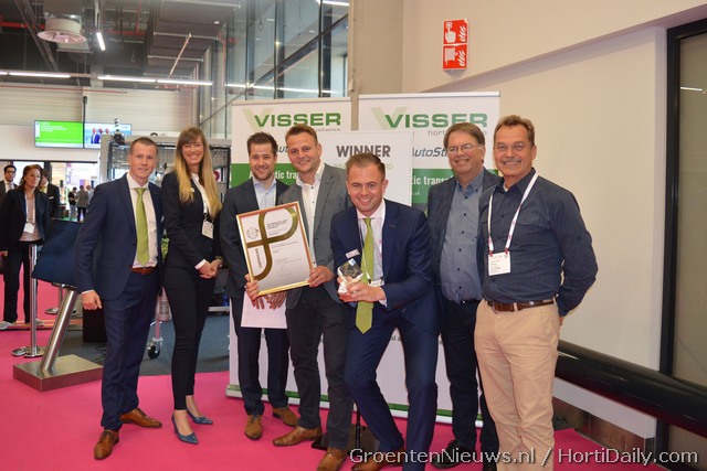 The proud winners of the GreenTech Innovation Award with their Autostix: Richard Groenewegen, Charlotte Langerak-Visser, Alex van Bruggen, Teun Hinze, Robbert-Jan In 't Veld, Ton Visser and Michael Henzler from Visser Horti Systems.