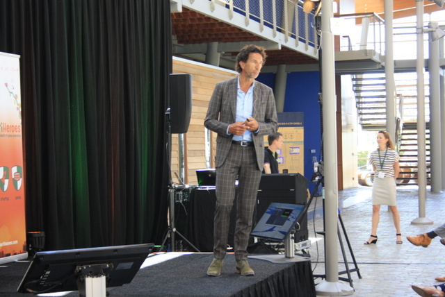 Juryvoorzitter Michael van Lier maakt bekend welk team de winnende pitch heeft gegeven.