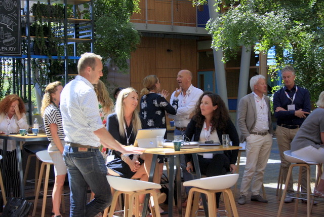 Arno Zerhusen van Pƶppelmann in gesprek met Mark van Antwerpen van Royal Brinkman, die een van de deelnemers is van het Academy-programma.