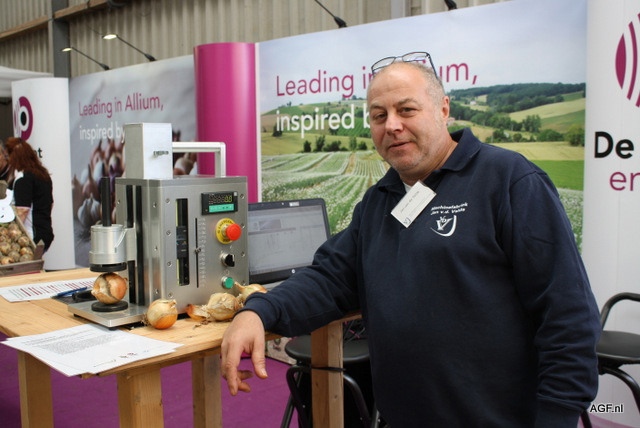 Jan van de Velde van de gelijknamige machinefabriek toont de nieuw ontwikkelde digitale hardheidsmeter voor uien