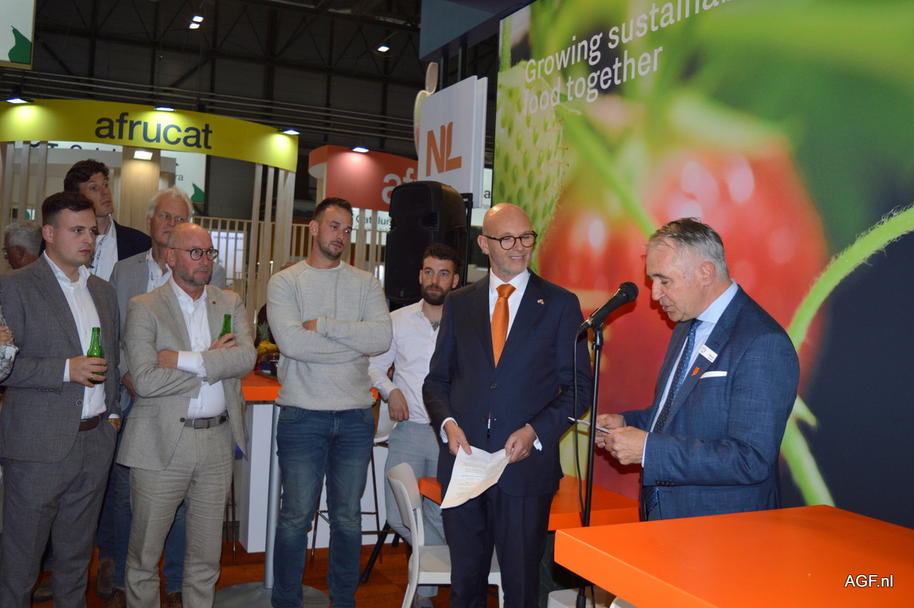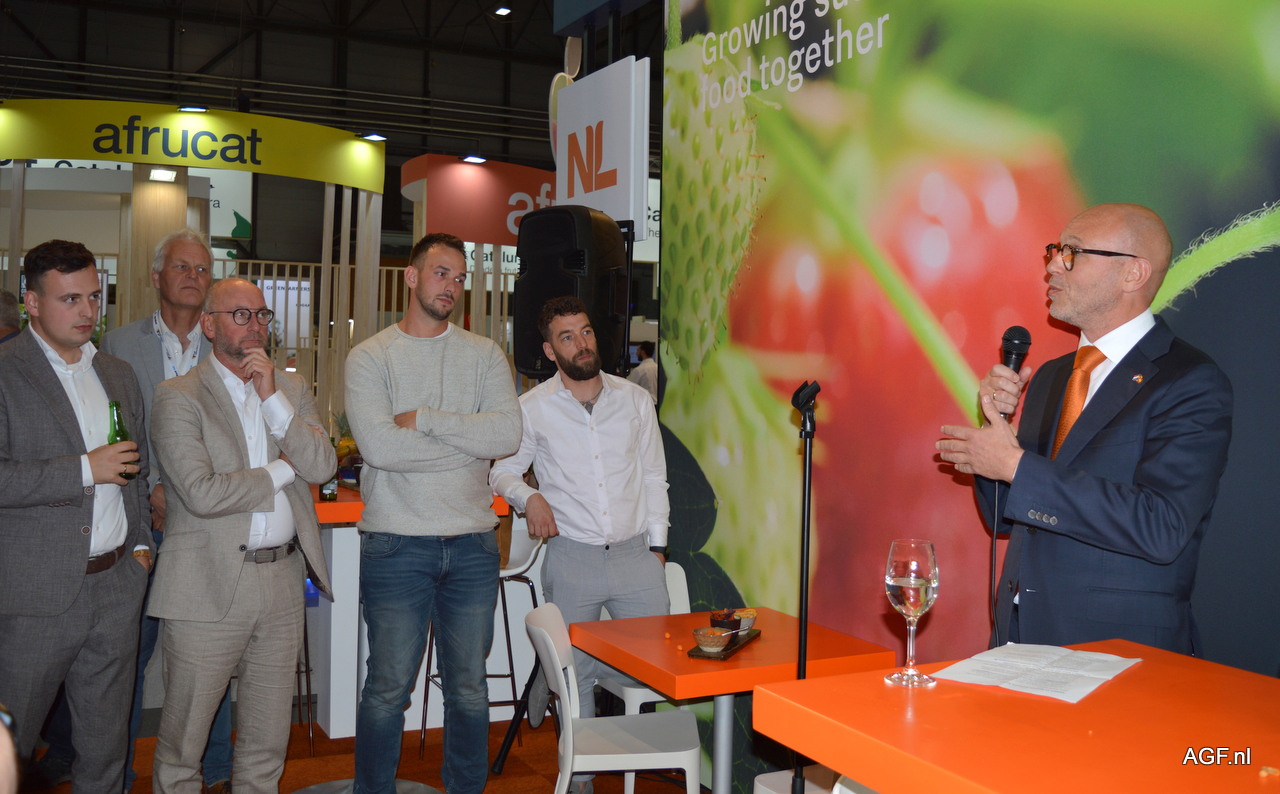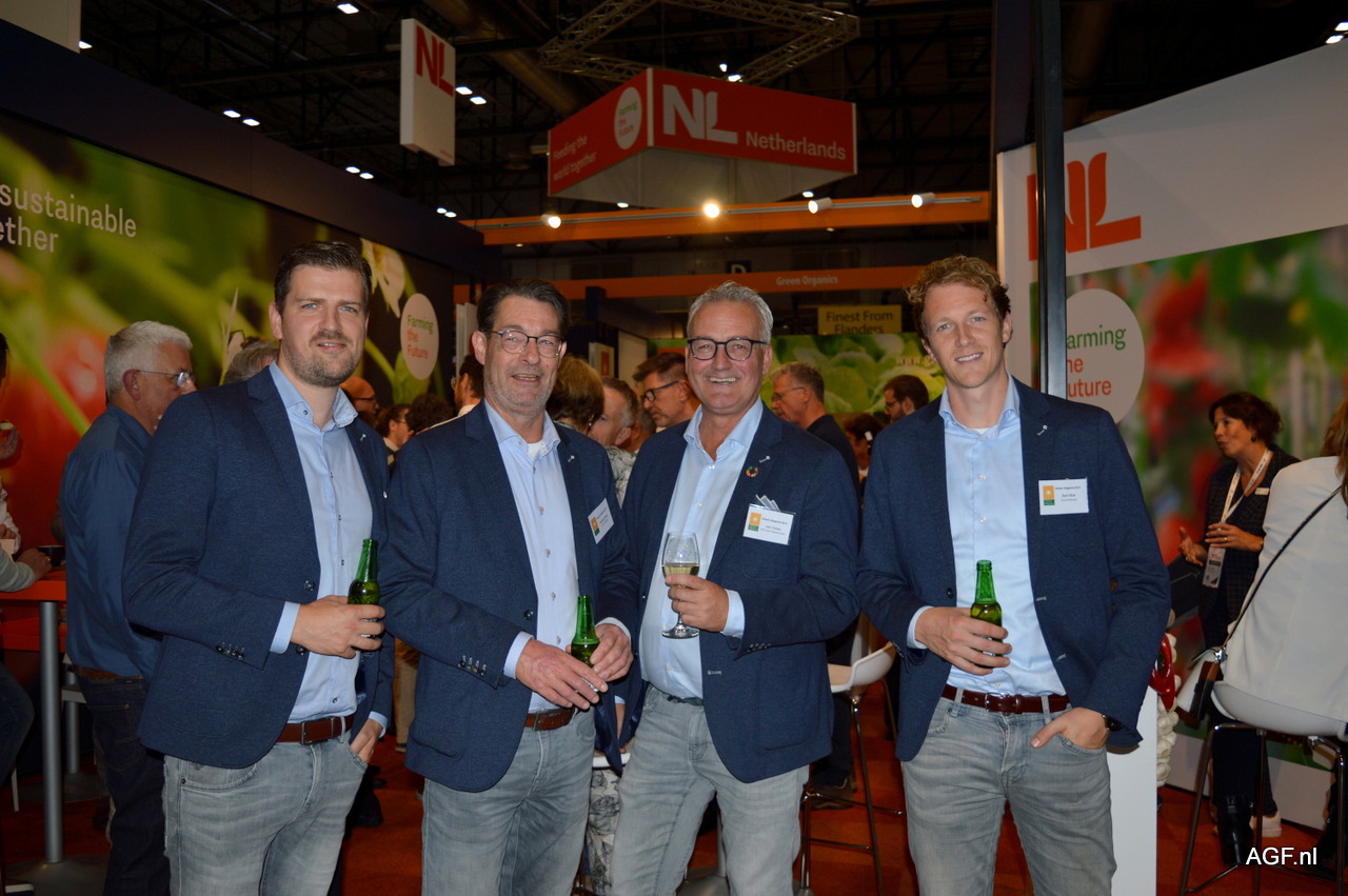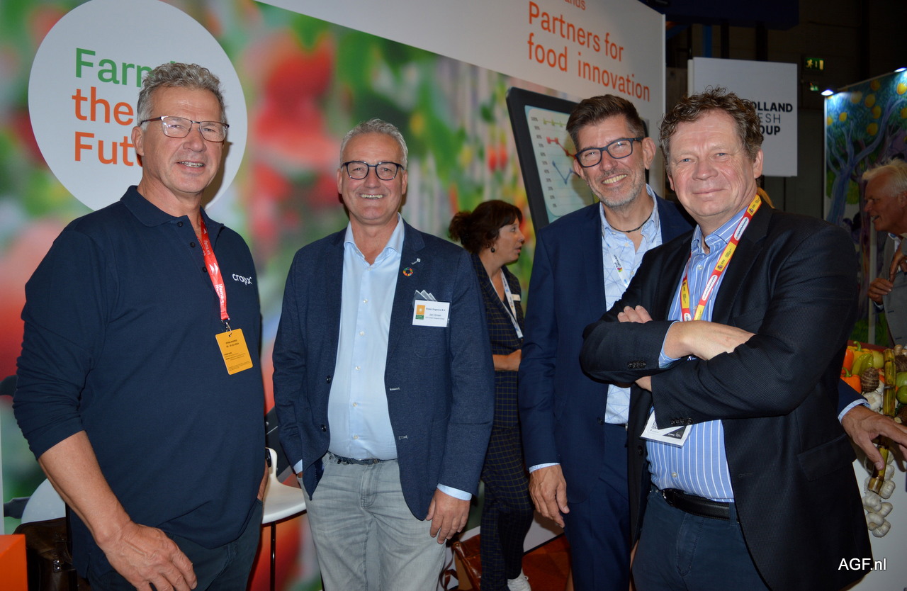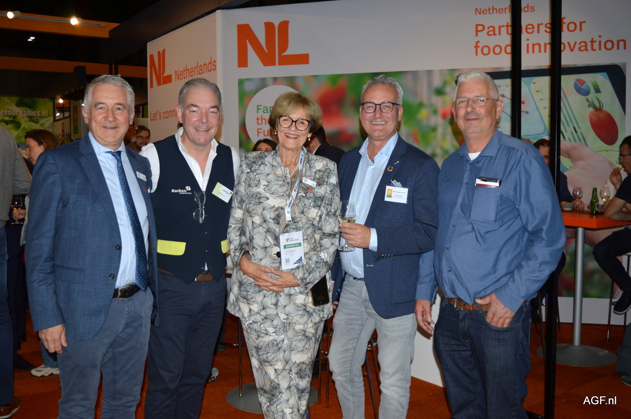 Richard Schouten van GroentenFruit Huis, Rob Banken van Banken Champignons, Cathy van Beek van GroentenFruit Huis, Jan Groen van Green Organics en Paul Peters van Gebr. Peters Fruithandel