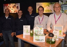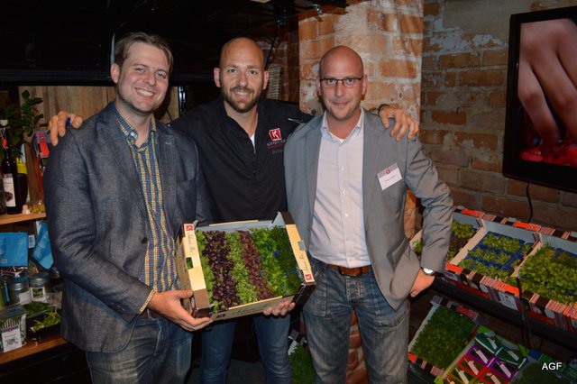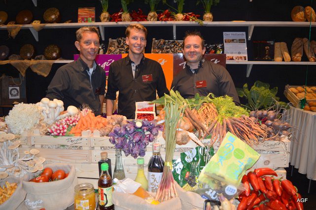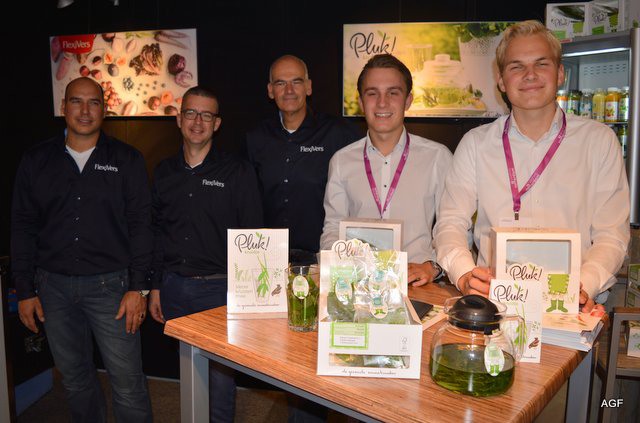 AGF horeca vers leverancier 'Flexivers' biedet een breed AGF assortiment w.o. gesneden groenten, Hollandse groenten, exoten, kruiden enz. Links Rudolf Sluymer, Arnold van Dalen, Marc Wildeman. Daarnaast de mannen van Plukkruidje, Timo Kleijwegt en Ruben Kleijwegt. Zij leveren verse theekruiden in 7 verschillende smaken.