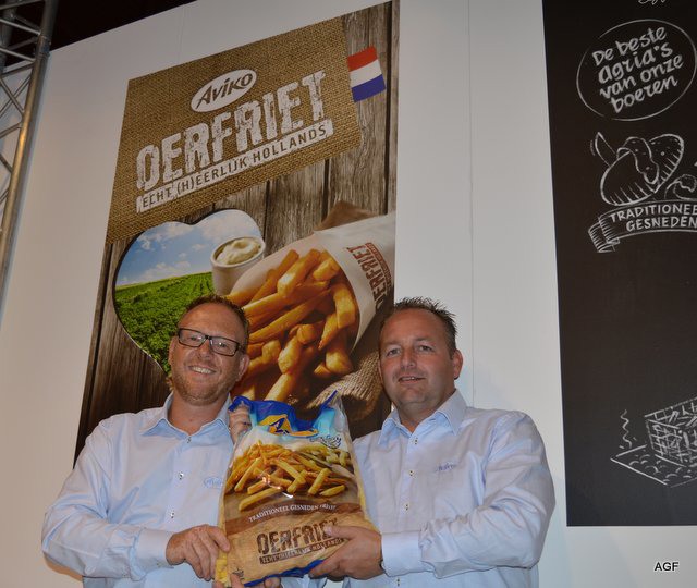 Oerfriet van Aviko. Beschikbaar in 11mm en 14mm. Een ambachtelijke friet. Links Dirk-Jan van der Meij en Marco Hellebrand.