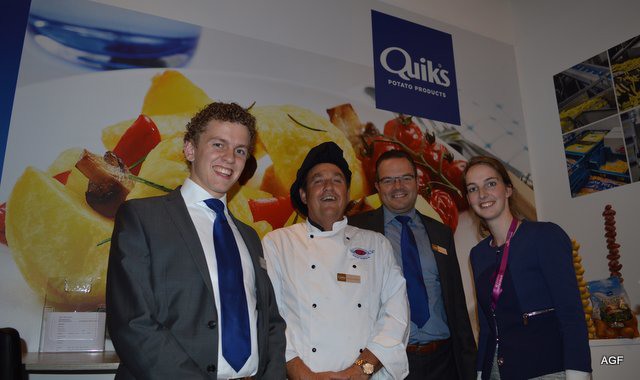 Het enthousiaste Quiks team. Quiks Potato Products levert momenteel voor de feestdagen aardappel gratin, aardappel bitterbal en halve roseval aardappeltjes. Ook verse friet gebakken in zonnebloemolie maakt onderdeel uit van het assortiment. Links Marco van Helden, de jarige Kees van der Burg, Peter Hoogendoorn en Roelijn Nuyt.