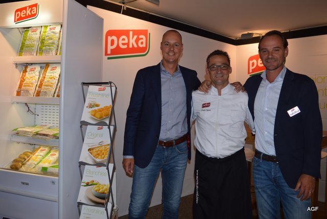 Peka Kroef is veelzijdige in aardappelproducten. Als voorbeeld werd genoemd de aardappelsalade gemaakt van aardappelgratin. Voorgegaarde aardappelproducten is de kern van het assortiment. Links Paul de Wit, Daan Spee en Harm Zom.