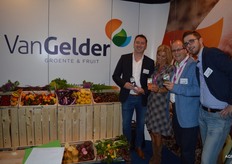 Van Gelder groente en fruit. Leverancier van een breed assortiment AGF. Snackgroenten is de agf-lijn voor de gezonde bite. Het assortiment omvat snacktomaat oranje, mix, geel en rood. Ook de snackkomkommer en paprika worden geleverd. Links Hans van der Wegen, Deborah Post van Rootz, Corné Pijnenburg en Marco de Fonkert.