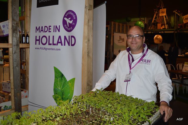 Han Lammers van PUUR-groenten vertelt met passie over zijn product. Dit bedrijf is sterk in minigroenten, kruiden en eetbare bloemen voor horeca ondernemers. Constante aanvoer en uniforme kwaliteit is waar Han voor staat. We proeven microvenkel met een lichte anijssmaak, mini komkommers van ongeveer 1 cm. Erg apart. Het assortiment omvat inmiddels zo'n 180 verschillende producten.