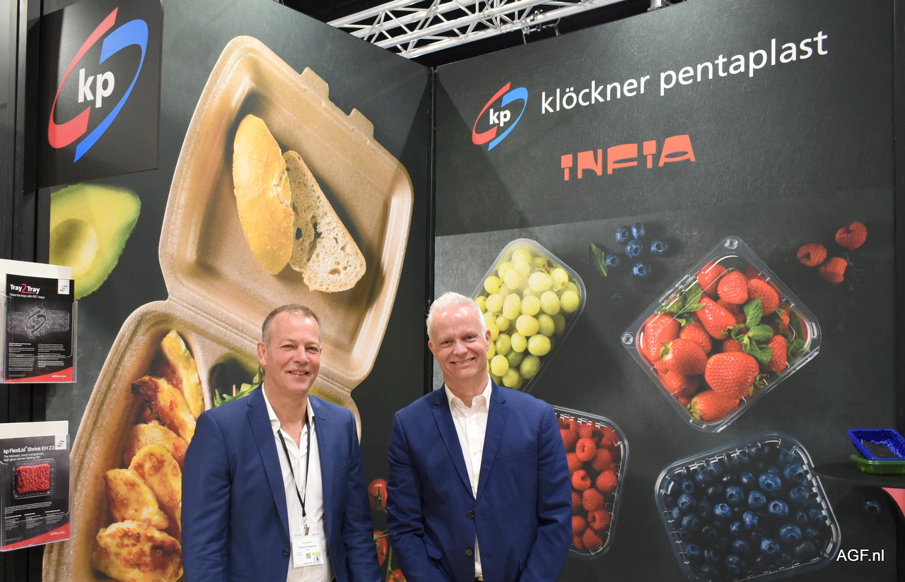 Auke Hylkema en Patrick Hilger van KP Klockner Pentaplast. Infia maakt schaaltjes etc. van RPet en PP materiaal.